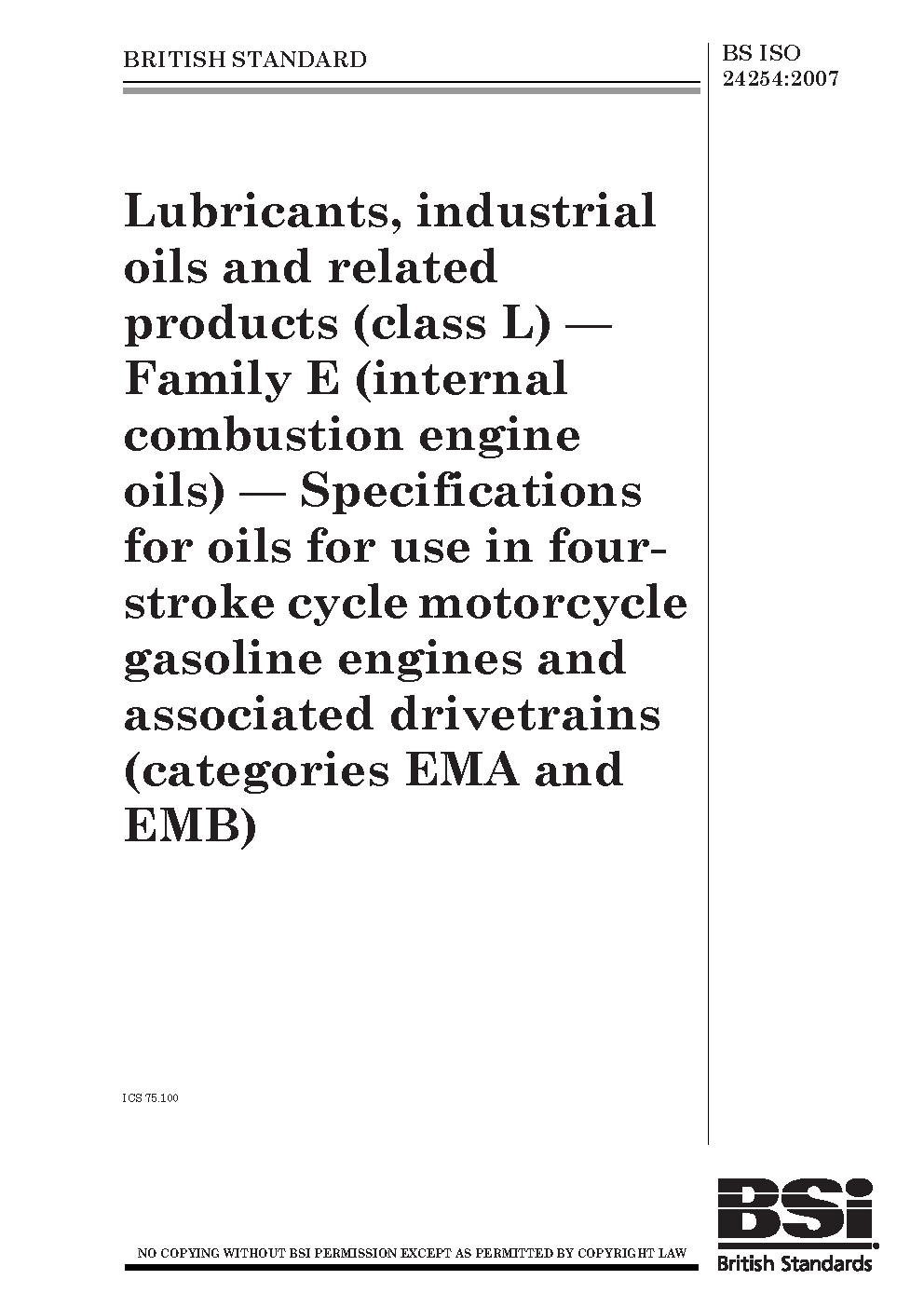 Lubricants, industrial oils and related products (class L). Family E (internal combustion engine oils). Specifications for oils for use in four-stroke cycle motorcycle gasoline engines and associated drivetrains (categories EMA and EMB)
