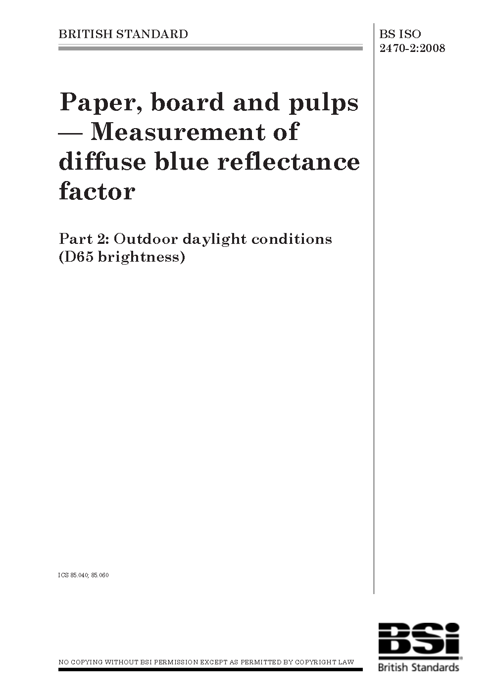 Paper, board and pulps. Measurement of diffuse blue reflectance factor Outdoor daylight conditions (D65 brightness)