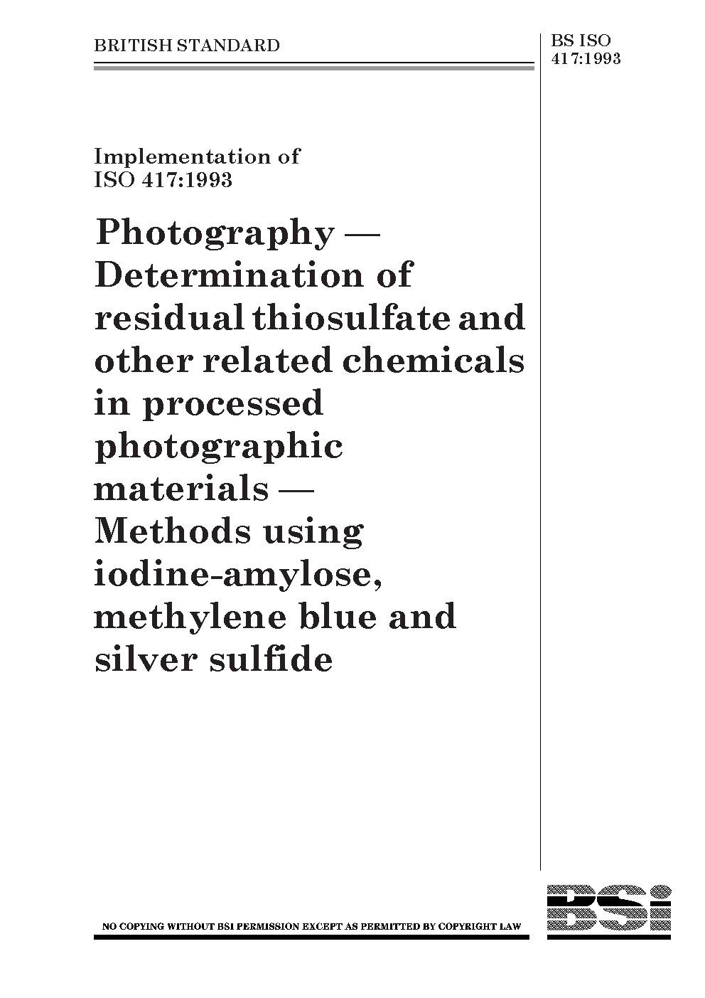 Photography. Determination of residual thiosulfate and other related chemicals in processed photographic materials. Methods using iodine-amylose, methylene blue and silver sulfide
