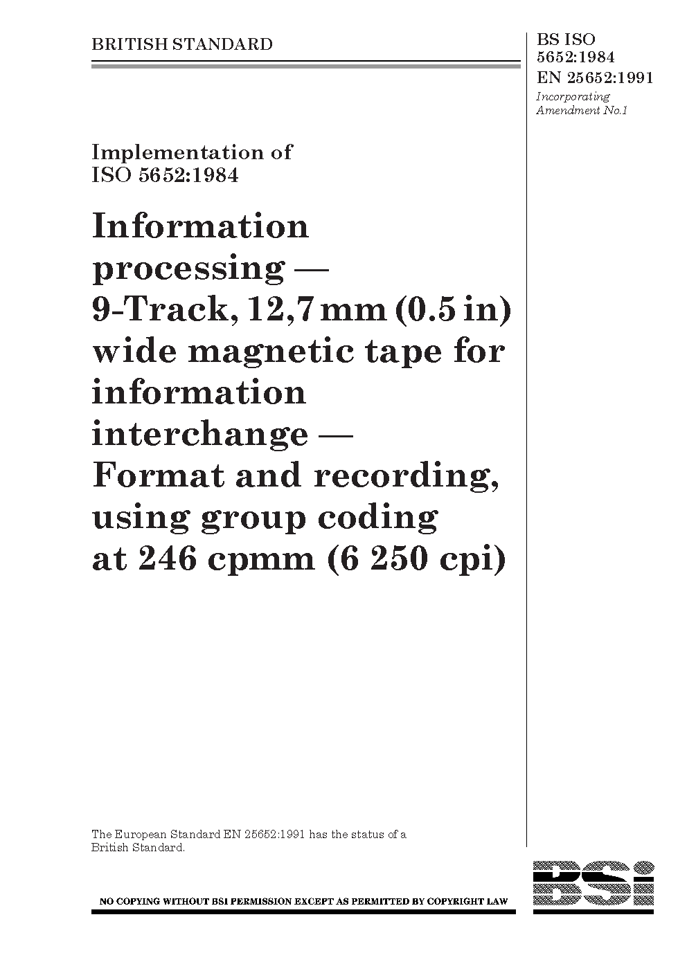 Information processing. 9-track, 12,7 mm (0.5 in) wide magnetic tape for information interchange. Format and recording, using group coding at 246 cpmm (6250 cpi)
