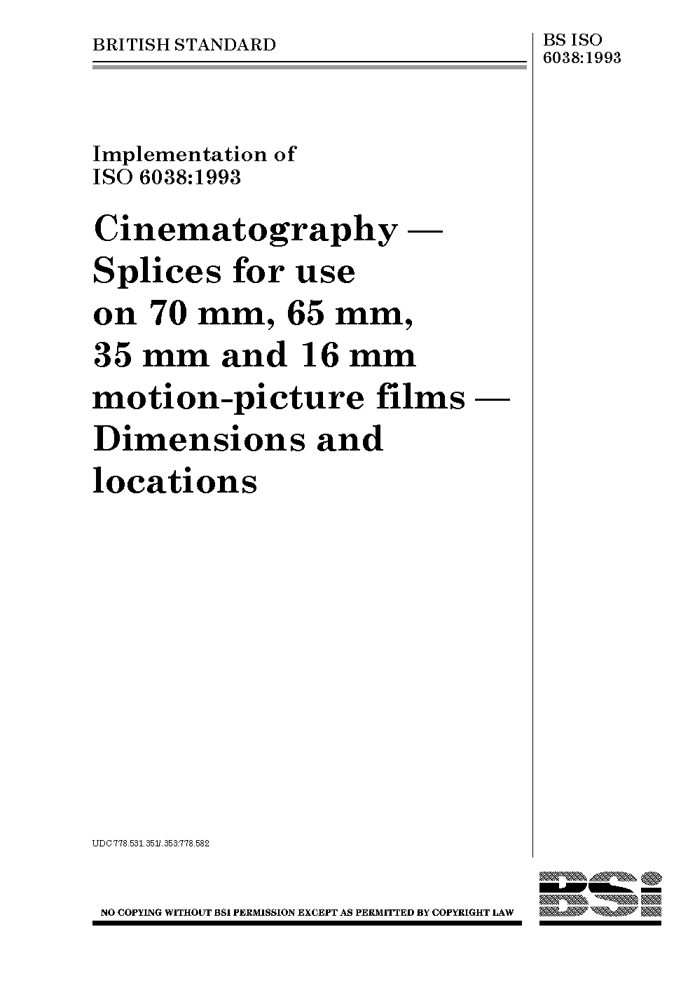 Cinematography. Splices for use on 70 mm, 65 mm, 35 mm and 16 mm motion-picture films. Dimensions and locations