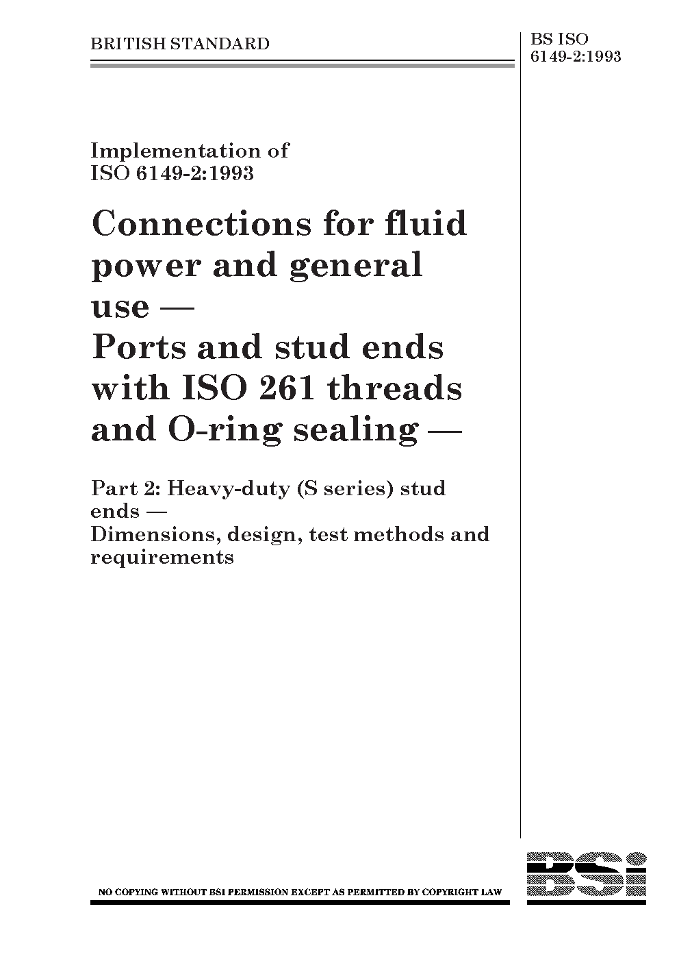 Connections for fluid power and general use. Ports stud ends with ISO 261 threads O-ring sealing Heavy-duty (S series) ends. Dimensions, design, test methods requirements.