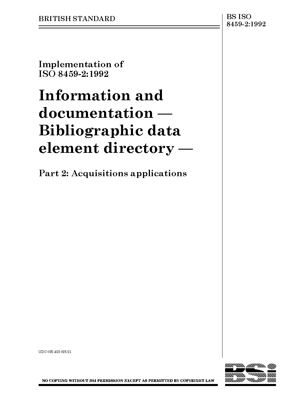 Information and documentation. Bibliographic data element directory Acquisitions applications