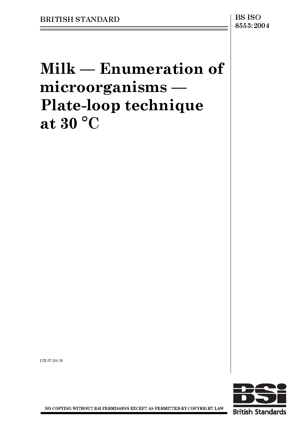Milk. Enumeration of microorganisms. Plate-loop technique at 30°C
