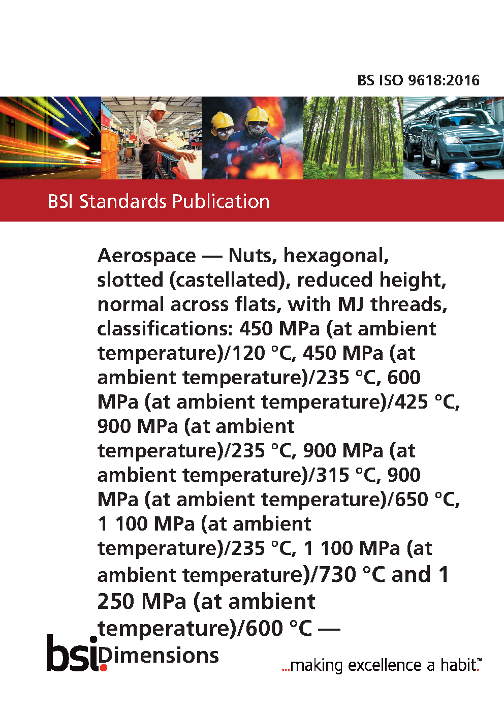 Aerospace. Nuts, hexagonal, slotted (castellated), reduced height, normal across flats, with MJ threads, classifications: 450 MPa (at ambient temperature)/120 °C, 450 MPa (at ambient temperature)/235 °C, 600 MPa (at ambient temperature)/425 °C, 900 MPa (at ambient temperature)/235 °C, 900 MPa (at ambient temperature)/315 °C, 900 MPa (at ambient temperature)/650 °C, 1 100 MPa (at ambient temperature)/235 °C, 1 100 MPa (at ambient temperature)/730 °C and 1 250 MPa (at ambient temperature)/600 °C. Dimensions