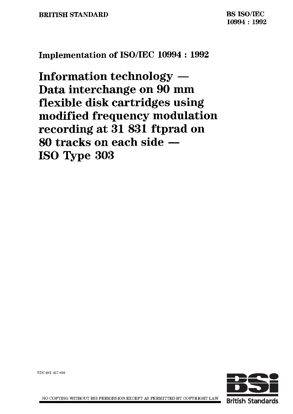 Information technology. Data interchange on 90 mm flexible disk cartridges using modified frequency modulation recording at 31 831 ftprad on 80 tracks on each side. ISO Type 303