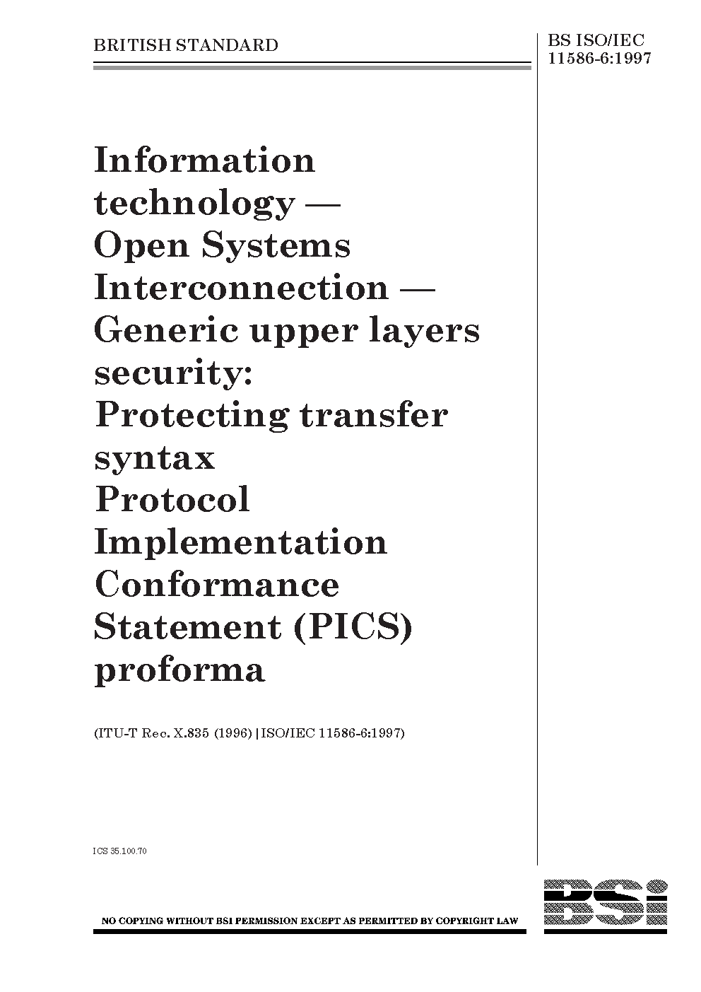 Information technology. Open systems interconnection. Generic upper layers security Protecting transfer syntax protocol implementation conformance statement (PICS) proforma
