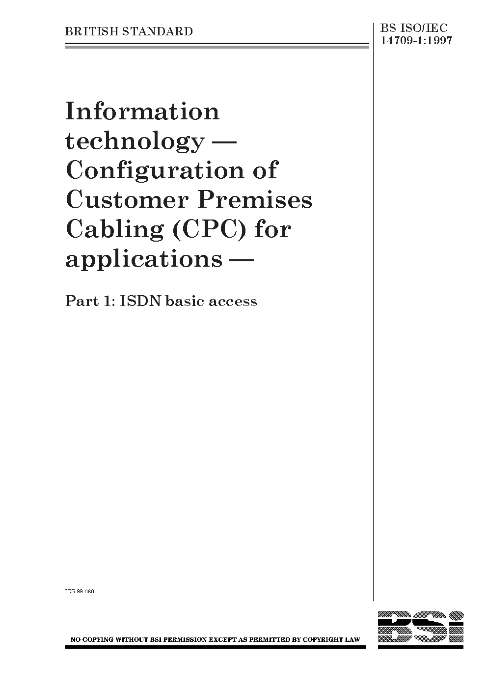 Information technology. Configuration of customer premises cabling (CPC) for applications ISDN basic access