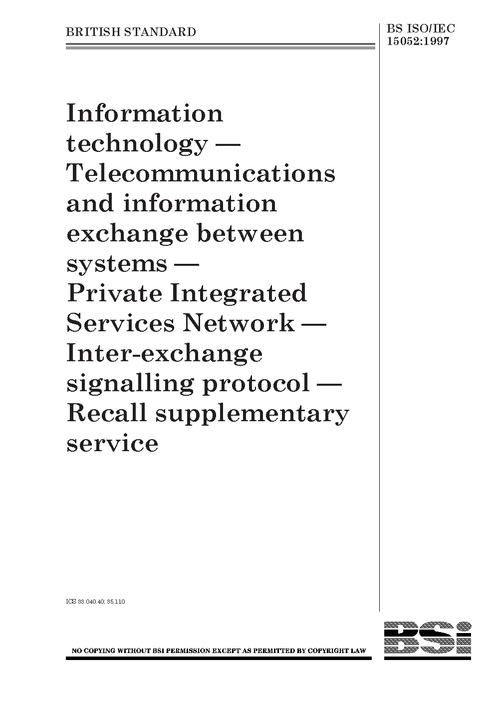 Information technology. Telecommunications and information exchange between systems. Private integrated services network. Inter-exchange signalling protocol. Recall supplementary service