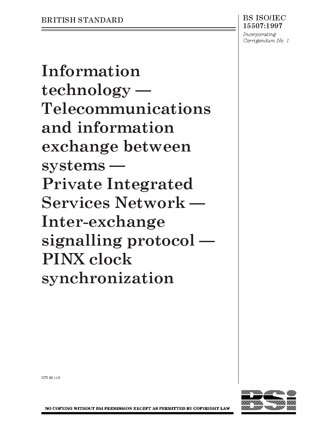 Information technology. Telecommunications and information exchange between systems. Private Integrated Services Network. Inter-exchange signalling protocol. PINX clock synchronization