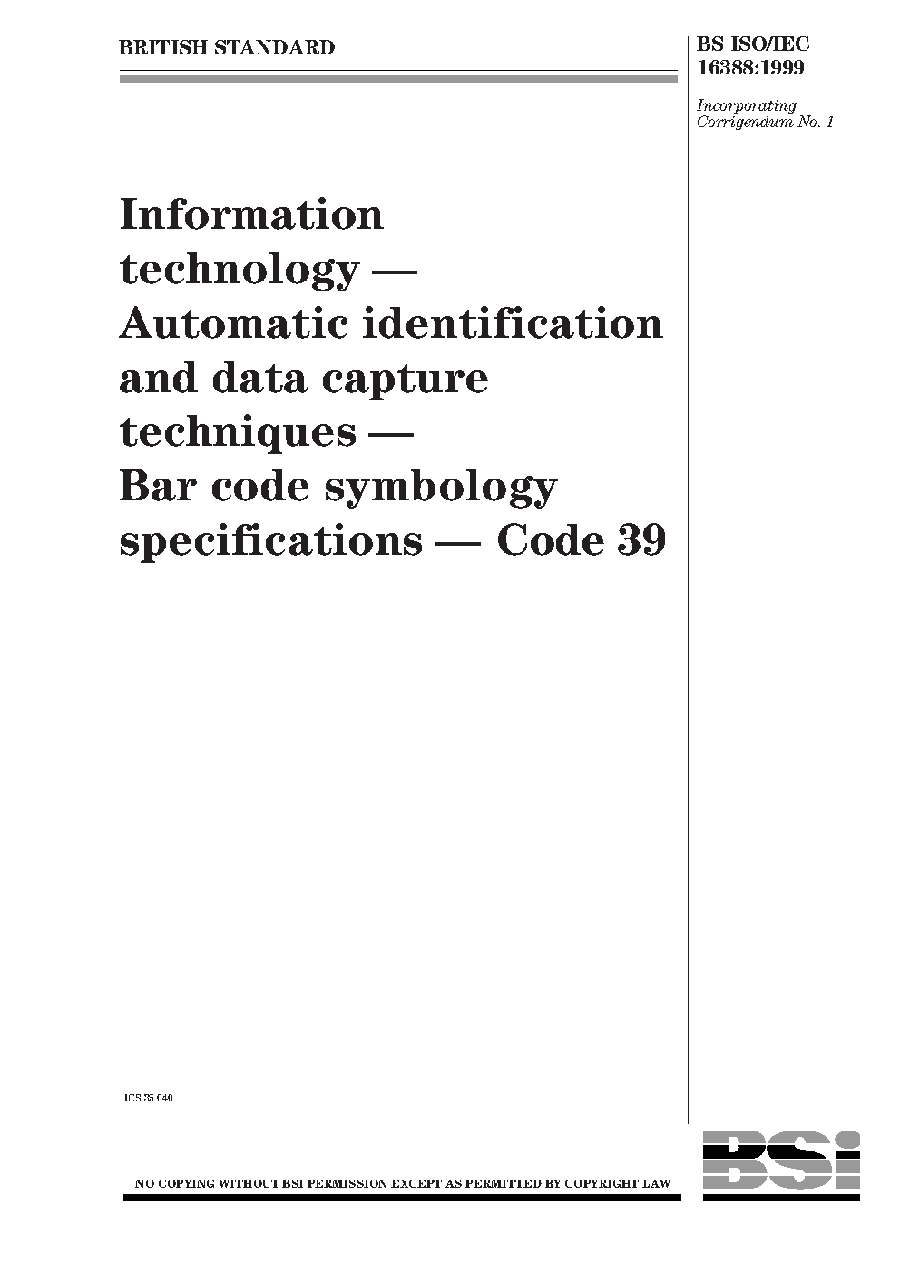 Information technology. Automatic identification and data capture techniques. Code 39 bar code symbology specification