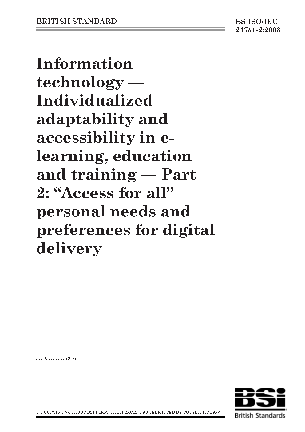 Information technology. Individualized adaptability and accessibility in e-learning, education training 'Access for all' personal needs preferences digital delivery