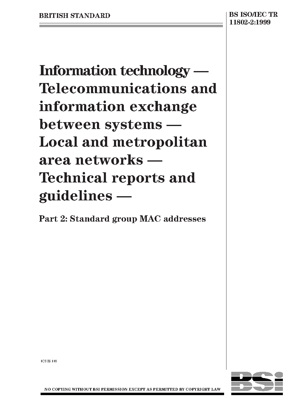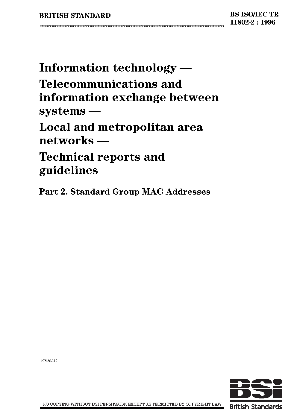 Information technology. Telecommunications and information exchange between systems. Local metropolitan area networks.Technical reports guidelines Standard group MAC addresses