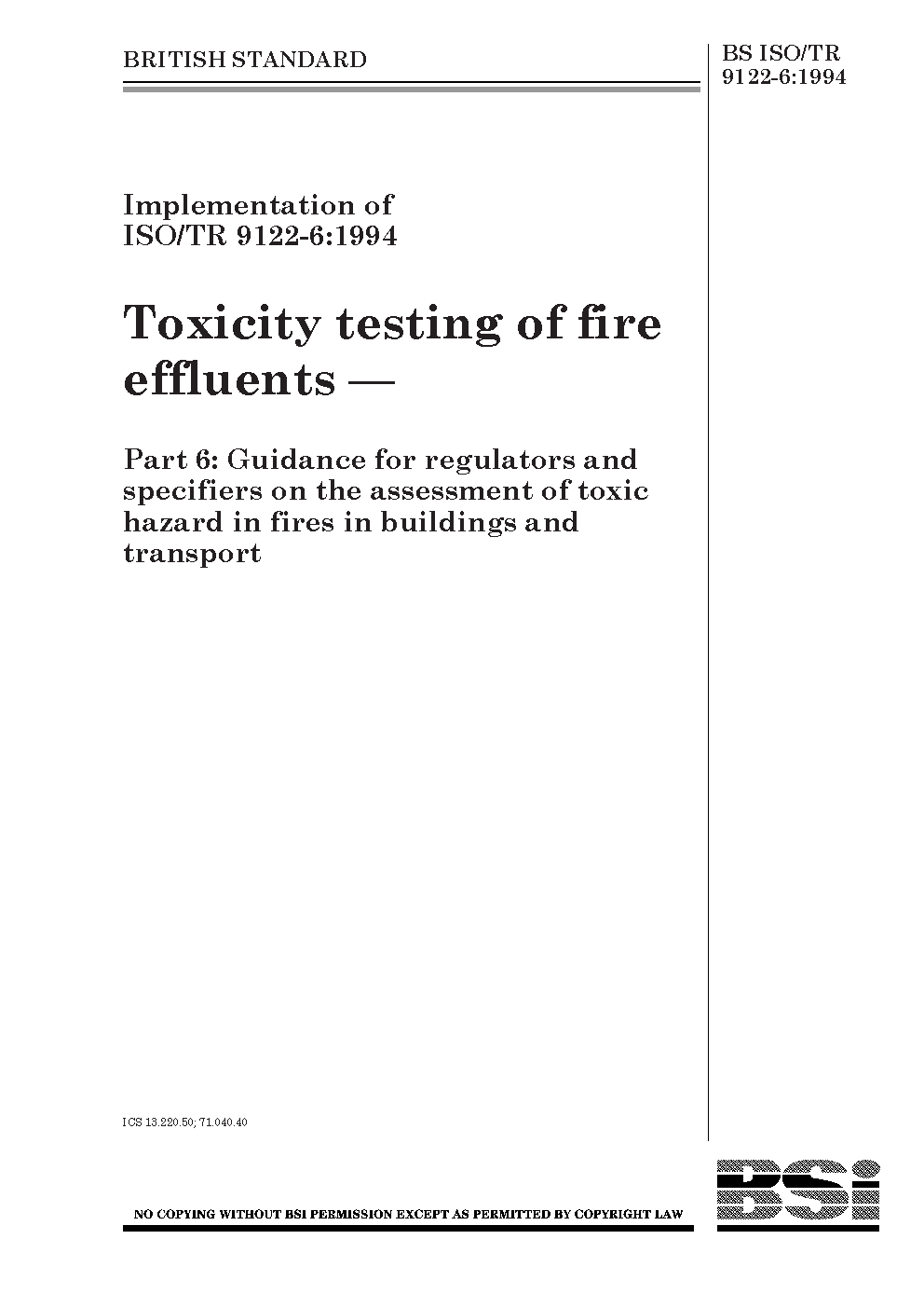 Toxicity testing of fire effluents Guidance for regulators and specifiers on the assessment toxic hazard in fires buildings transport
