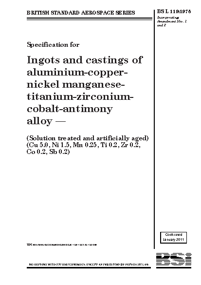 Specification for ingots and castings of aluminium-copper-nickel-manganese-titanium-zirconium-cobalt-antimony alloy (solution treated and artificially aged) (Cu 5.0, Ni 1.5, Mn 0.25, Ti 0.2, Zr 0.2, Co 0.2, Sb 0.2)