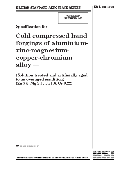 Specification. Cold compressed hand forgings of aluminium-zinc-magnesium-copper-chromium alloy (solution treated and artificially aged to an overaged condition) (Zn 5.6, Mg 2.5, Cu 1.6, Cr 0.22)