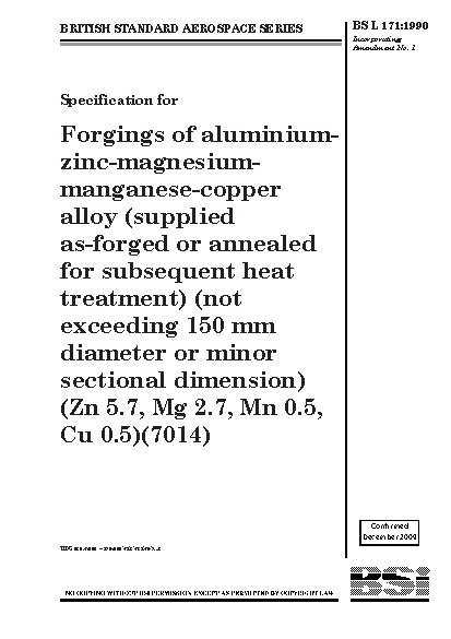 Specification for forging of aluminium-zinc-magnesium-manganese-copper alloy (supplied as-forged or annealed for subsequent heat treatment) (not exceeding 150 mm diameter or minor sectional dimension) (Zn 5.7, Mg 2.7, Mn 0.5, Cu 0.5) (7014)