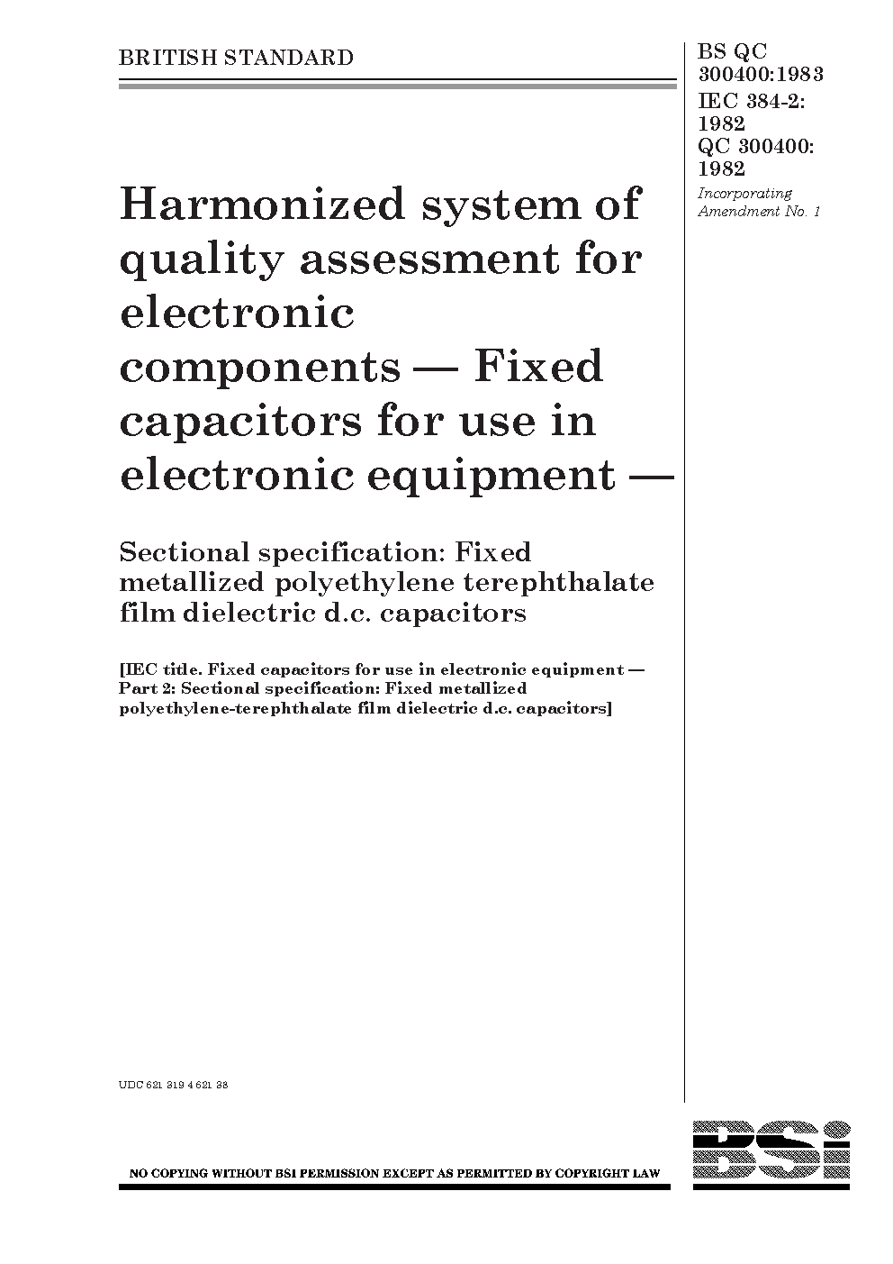 Harmonized system of quality assessment for electronic components. Fixed capacitors for use in electronic equipment. Sectional specification: fixed metallized polyethylene terephthalate film dielectric d.c. capacitors