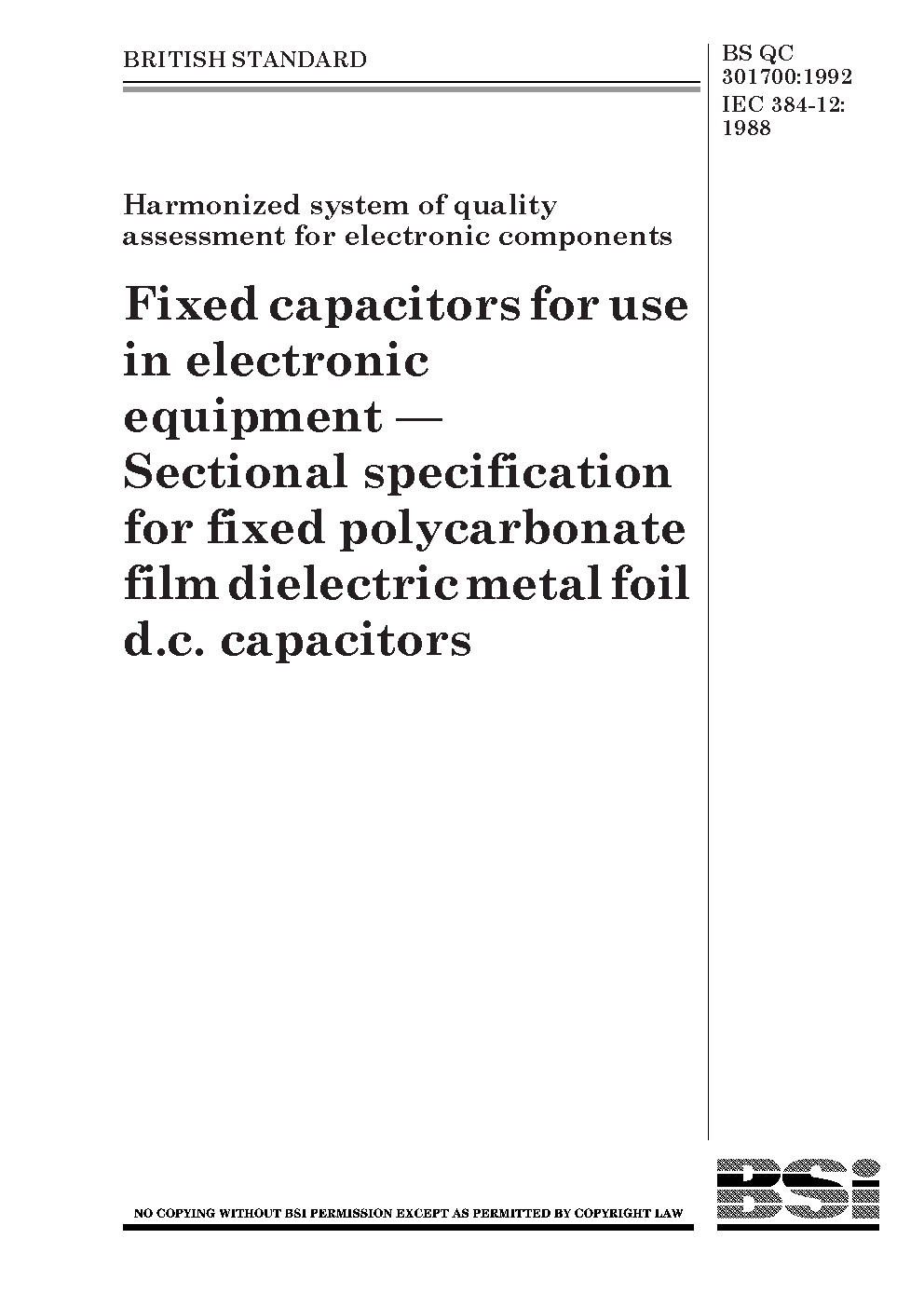 Harmonized system of quality assessment for electronic components. Fixed capacitors for use in electronic equipment. Sectional specification for fixed polycarbonate film dielectric metal foil d.c. capacitors