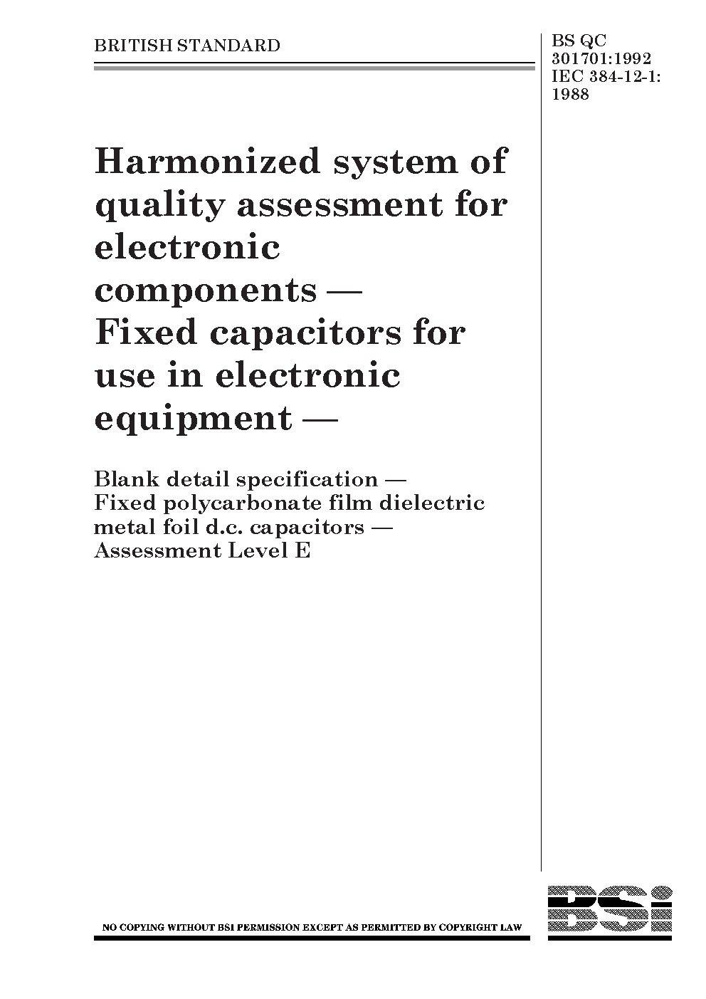 Harmonized system of quality assessment for electronic components. Fixed capacitors for use in electronic equipment. Blank detail specification. Fixed polycarbonate film dielectric metal foil d.c. capacitors. Assessment level E