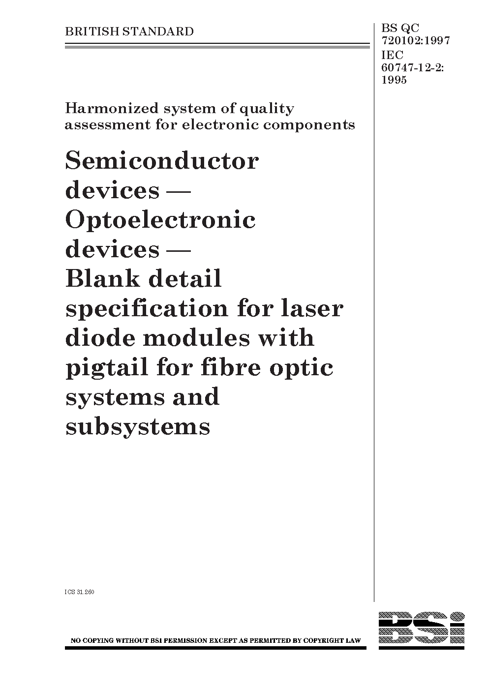 Blank detail specification for laser diode modules with pigtail for fibre optic systems and subsystems