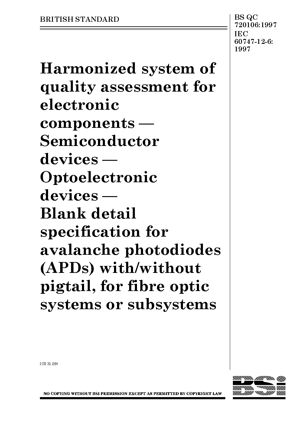 Harmonized system of quality assessment for electronic components. Semiconductor devices. Optoelectronic devices. Blank detail specification for avalanche photodiodes (APDs) with/without pigtail, for fibre optic systems or subsystems