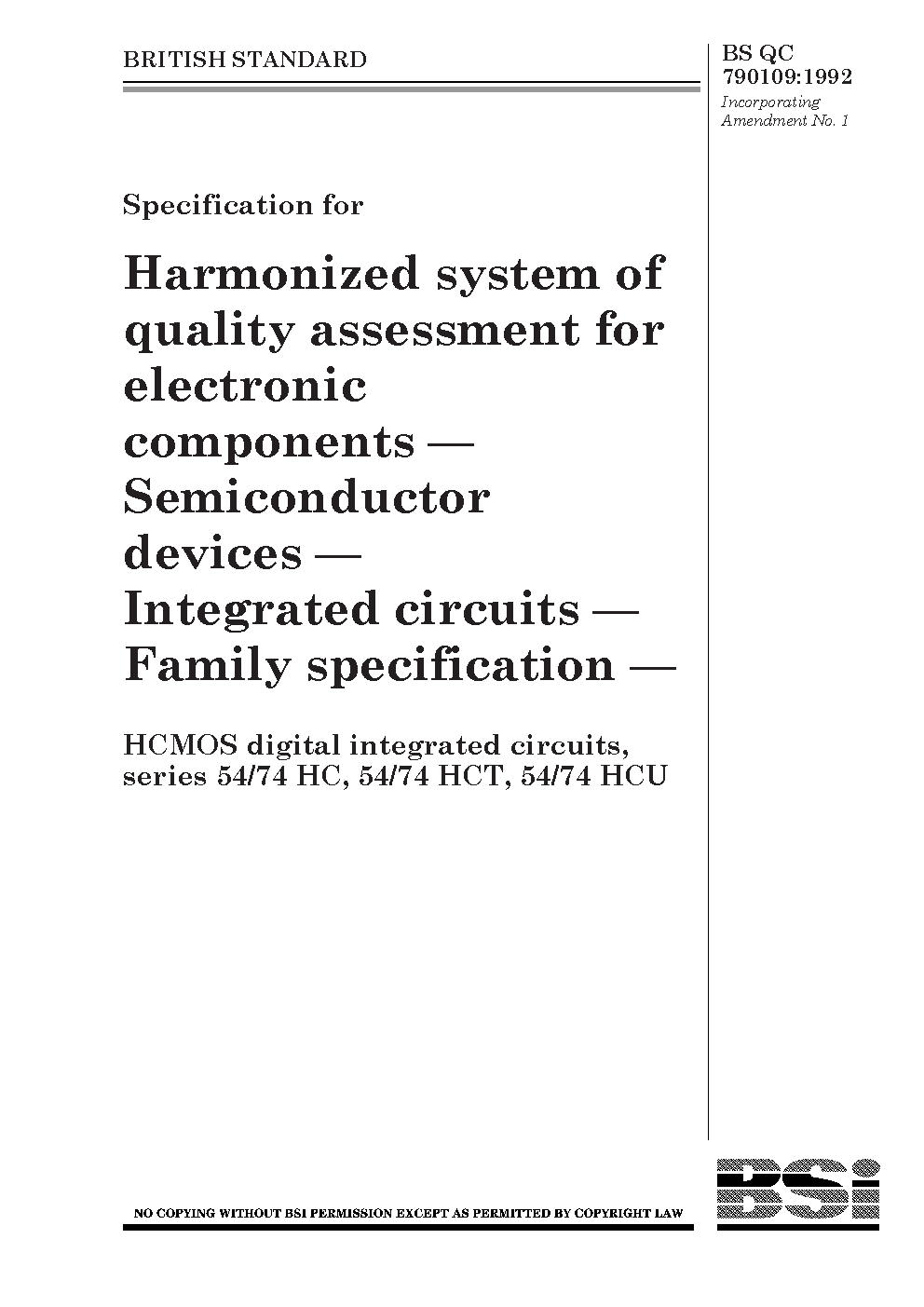 Specification for harmonized system of quality assessment for electronic components. Semiconductor devices. Integrated circuits.Family specification for HCMOS digital integrated circuits series 54/74 HC, 54/74 HCT, 54/74 HCU