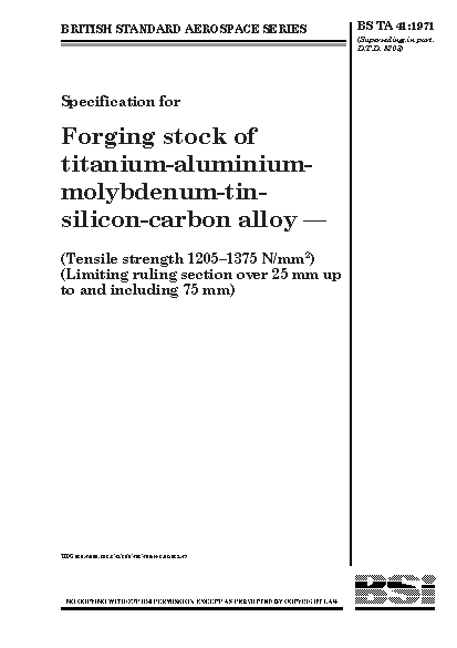Specification for forging stock of titanium-aluminium-molybdenum-tin-silicon-carbon alloy (tensile strength 1205-1375 N/mm2) (limiting ruling section over 25 mm up to and including 75 mm)