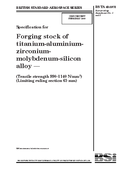 Specification for forging stock of titanium-aluminium-zirconium-molybdenum-silicon alloy (tensile strength 990-1140 N/mm2) (limiting ruling section 65 mm)