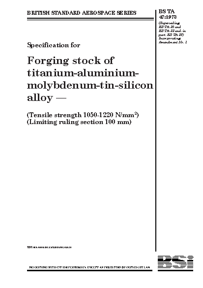 Specification for forging stock of titanium-aluminium-molybdenum-tin-silicon alloy (tensile strength 1050-1220 N/mm2) (limiting ruling section 100 mm)