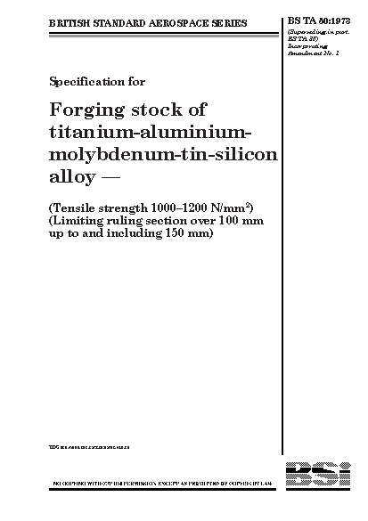 Specification for forging stock of titanium-aluminium-molybdenum-tin-silicon alloy (tensile strength 1000-1200 N/mm2) (limiting ruling section over 100 mm up to and including 150 mm)