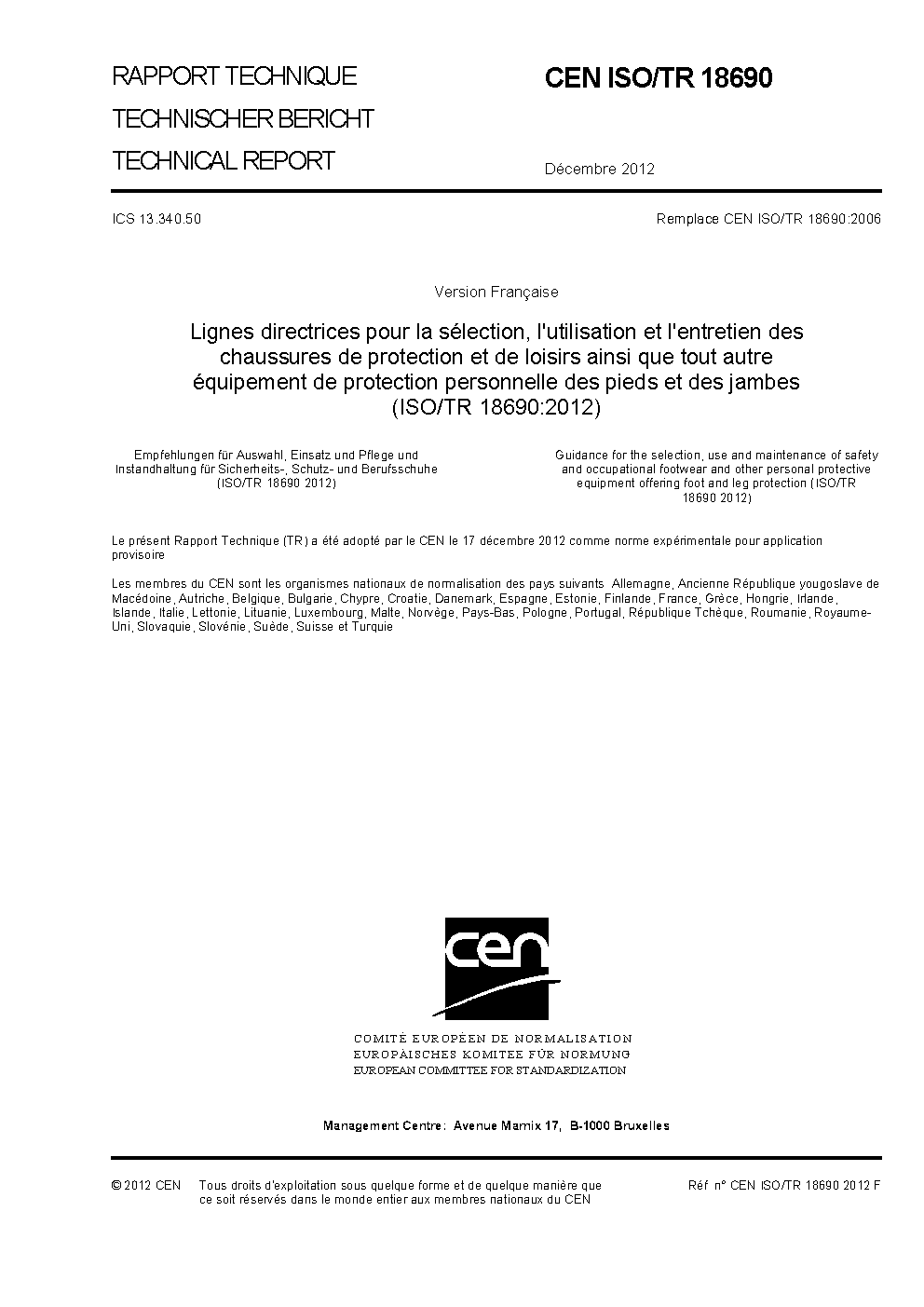 ISO/TR 18690:2006 provides guidance for selection, use and maintenance of safety, protective and occupational footwear for professional use. It is designed for footwear manufacturers, suppliers, employers and self employed people, safety engineers and users. ISO/TR 18690:2006 also provides guidance for preparing national guidance in this area.