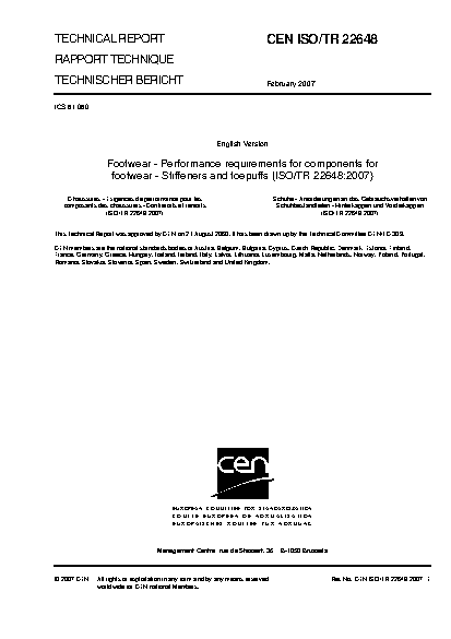 ISO/TR 22648:2007 establishes the performance requirements for stiffener and toepuff components for footwear (not for finished footwear), irrespective of the material, in order to assess the suitability for the end use and/or fitness for purpose. It also establishes the test methods to be used to evaluate the compliance with the requirements.
