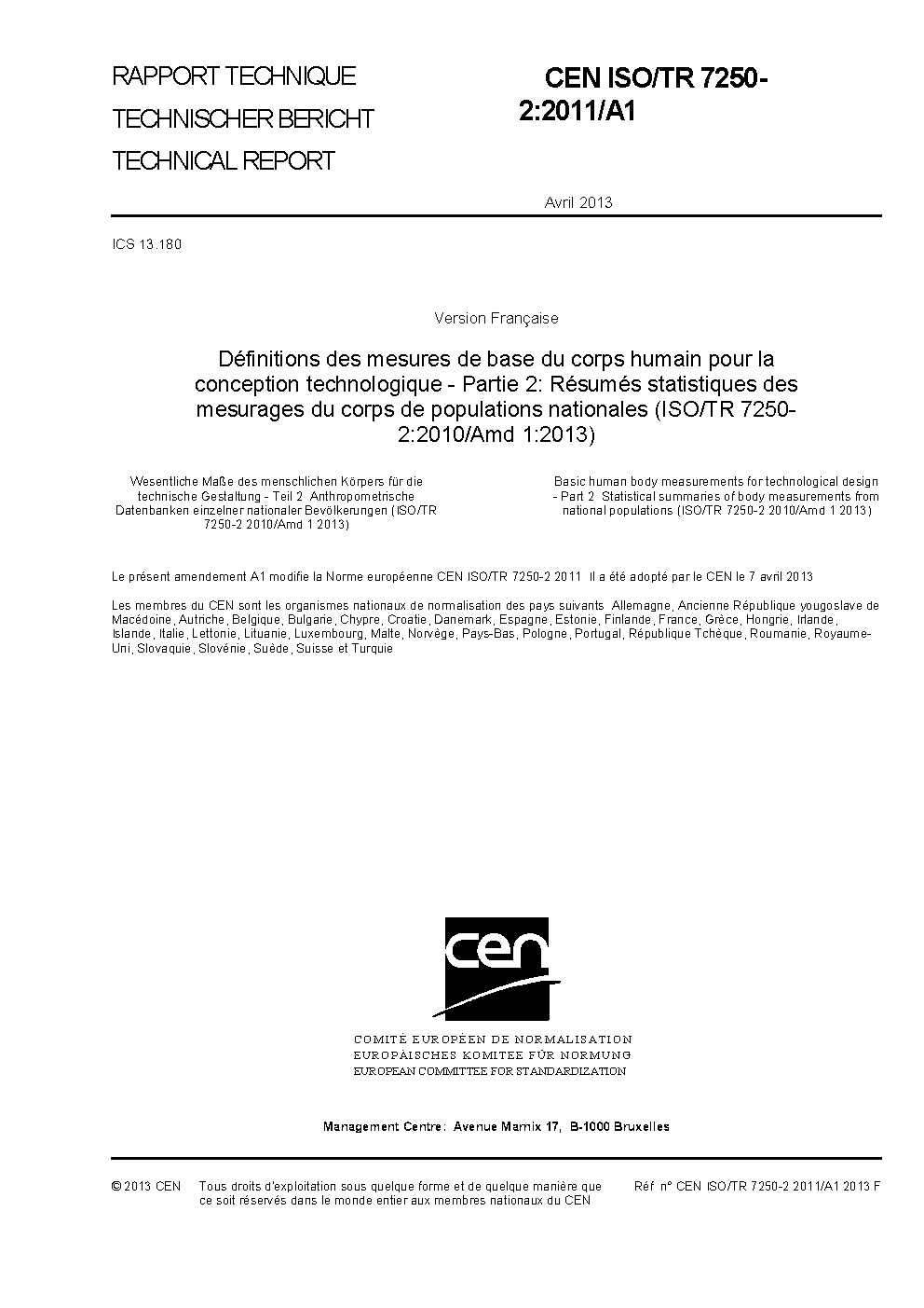 Basic human body measurements for technological design - Part 2: Statistical summaries of body measurements from national populations (ISO/TR 7250-2:2010/Amd 1:2013)