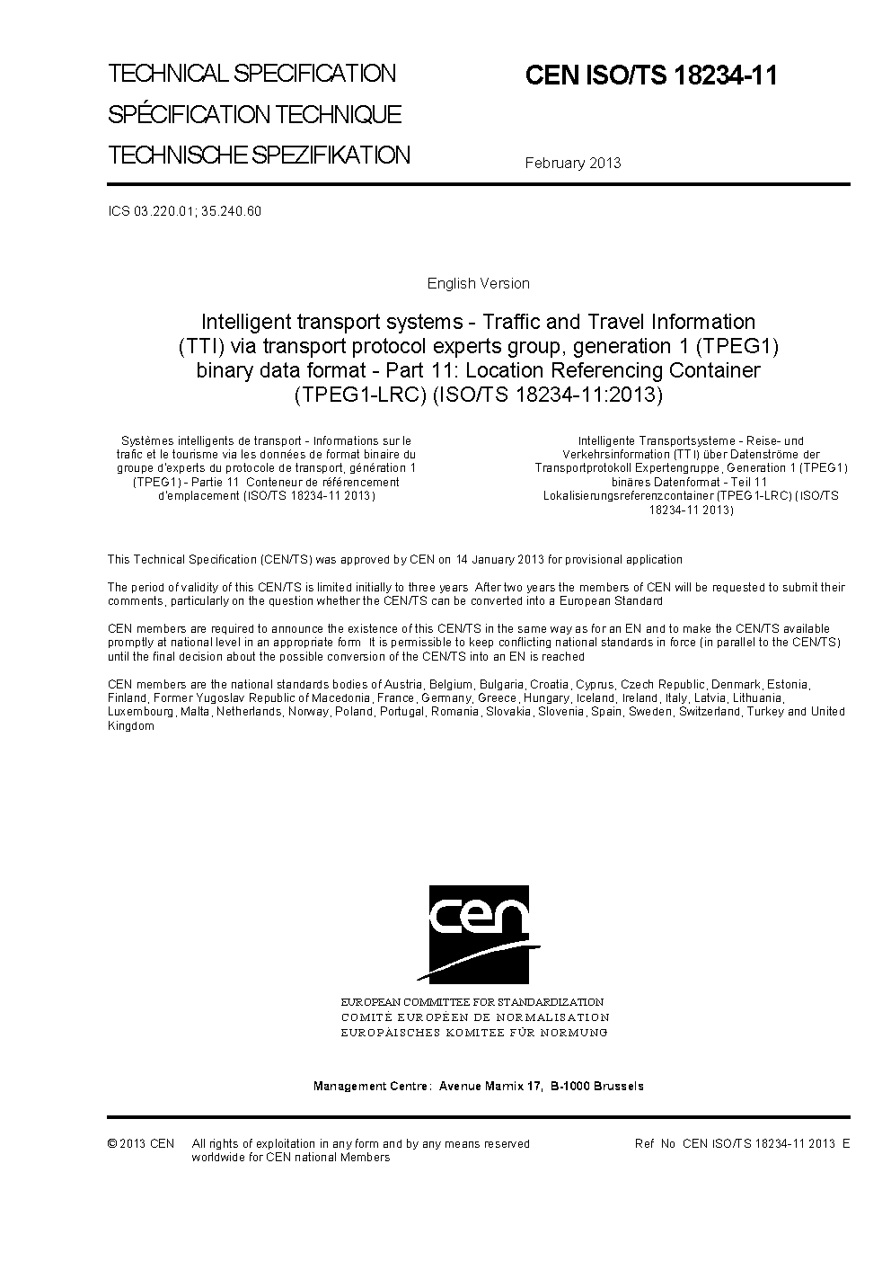 Intelligent transport systems - Traffic and Travel Information (TTI) via transport protocol experts group, generation 1 (TPEG1) binary data format - Part 11: Location Referencing Container (TPEG1-LRC) (ISO/TS 18234-11:2013)