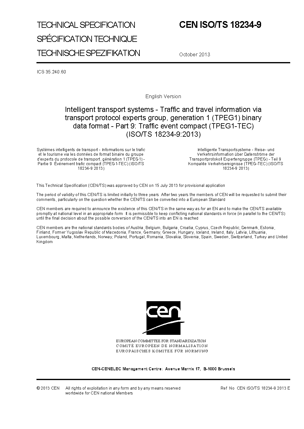Intelligent transport systems - Traffic and travel information via transport protocol experts group, generation 1 (TPEG1) binary data format - Part 9: Traffic event compact (TPEG1-TEC) (ISO/TS 18234-9:2013)
