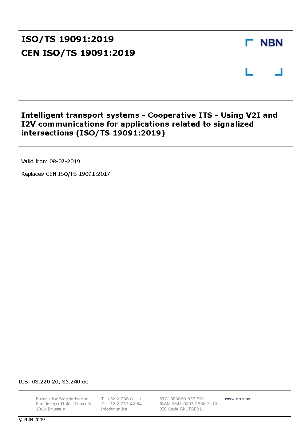 Intelligent transport systems - Cooperative ITS - Using V2I and I2V communications for applications related to signalized intersections (ISO/TS 19091:2019)