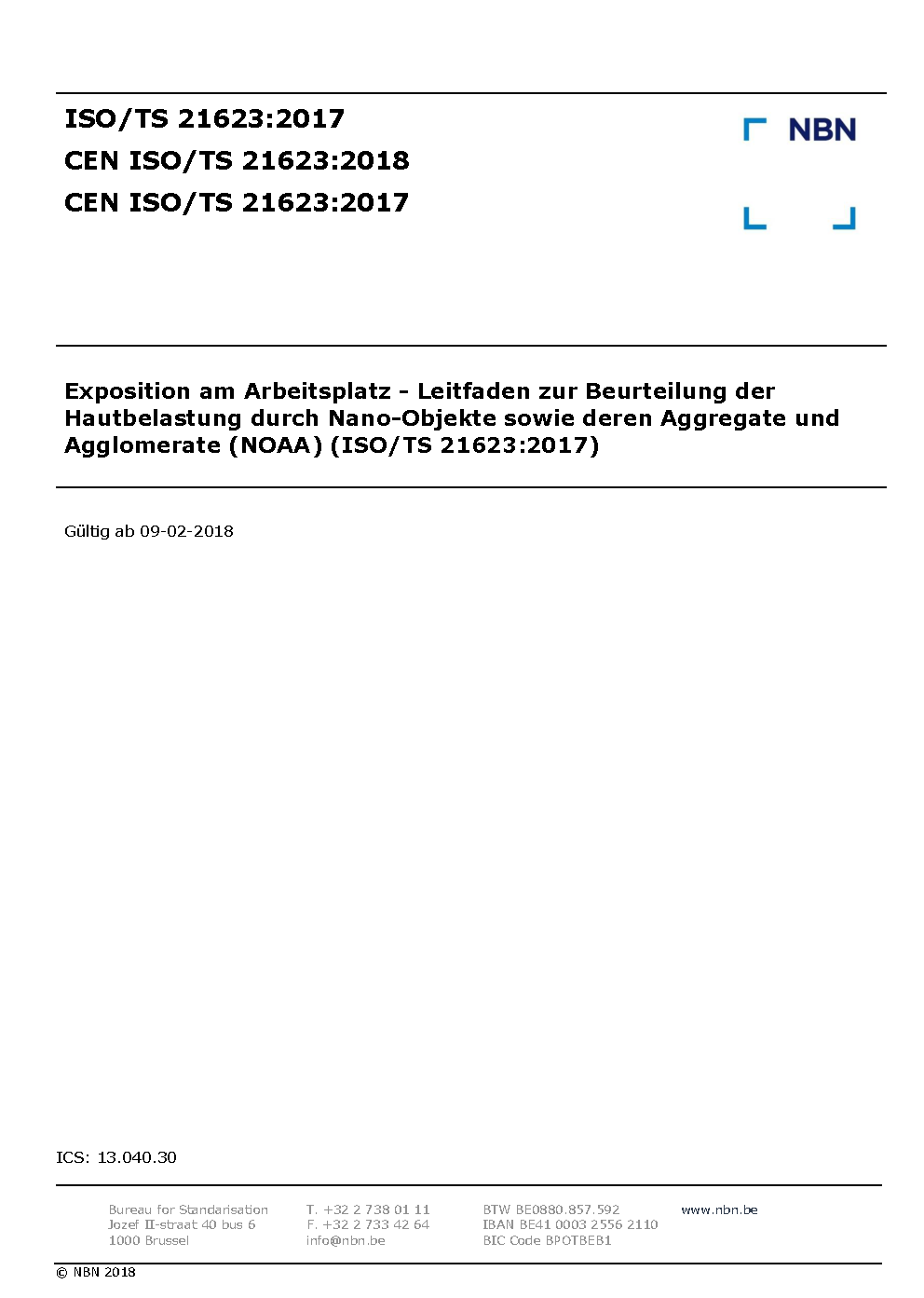 Workplace exposure - Assessment of dermal exposure to nano-objects and their aggregates and agglomerates (NOAA) (ISO/TS 21623:2017)