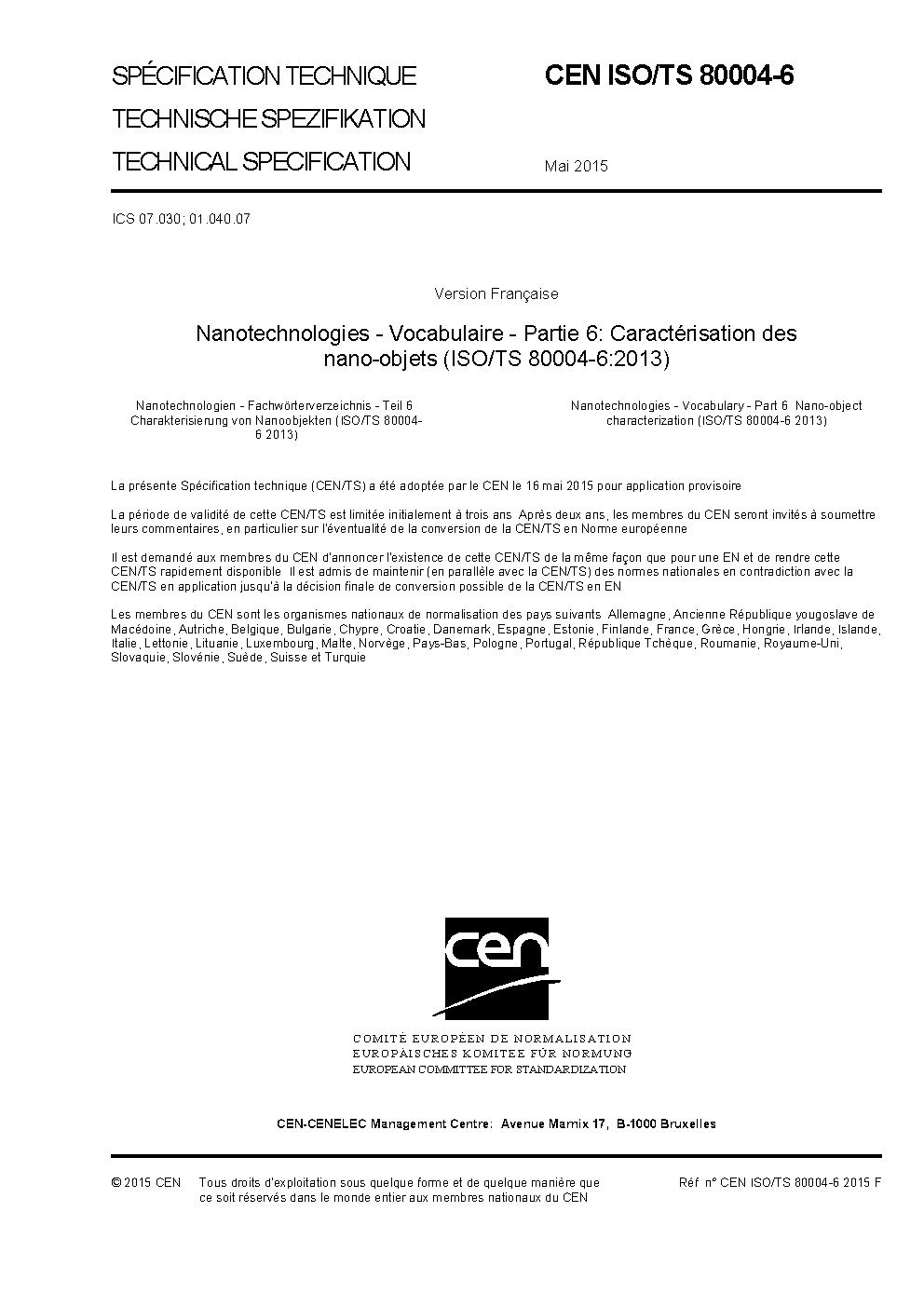 Nanotechnologies - Vocabulary - Part 6: Nano-object characterization (ISO/TS 80004-6:2021)