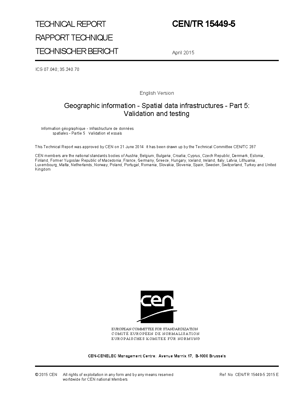 This part of the Technical Report provides guidance for validation and testing of data, metadata and services, as the main Spatial Data Infrastructure (SDI) components defined in other parts of CEN/TR 15449.
