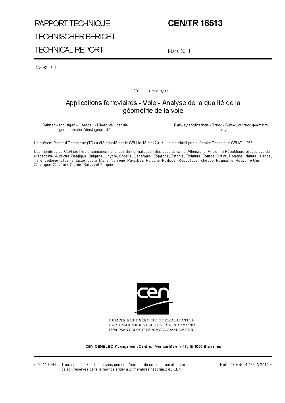 CEN/TC 256/SC 1/WG 28 "Railway applications/Infrastructure/Track geometry quality" conducted a survey of the geometric quality of track across European railway networks. This was to get an understanding and overview of the track geometry across Europe in order to support the definition of track geometric quality classes for the writing of EN 13848-6.
