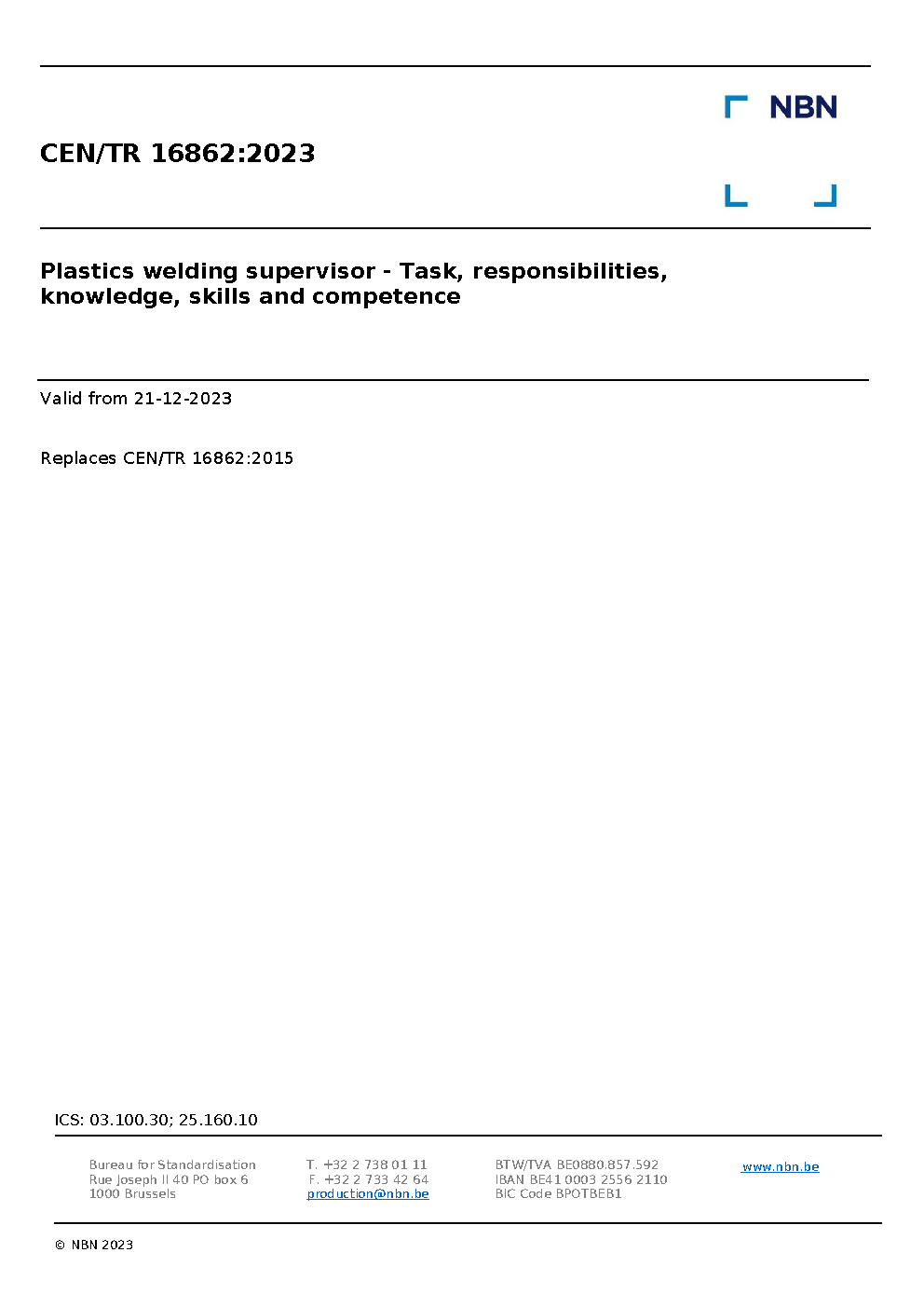 This Technical Report identifies the quality related responsibilities and tasks included in the supervision of activities related to the welding of products and semi-finished products made of thermoplastic materials and provides guidelines to ensure the quality of the supervision.