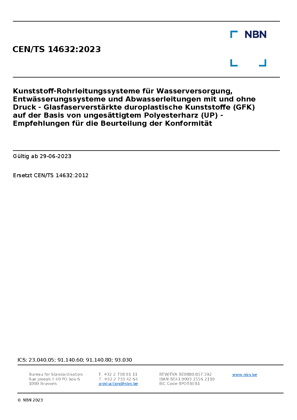 This Technical Specification gives guidance for parties involved in the assessment of conformity of piping systems made from GRP-UP (glass-reinforced thermosetting resins based on unsaturated polyesters) intended to be used for drainage, sewerage or water supply. It contains procedures for the assessment of conformity to the requirements in the relevant system standards for materials, pipes, fittings and joints.