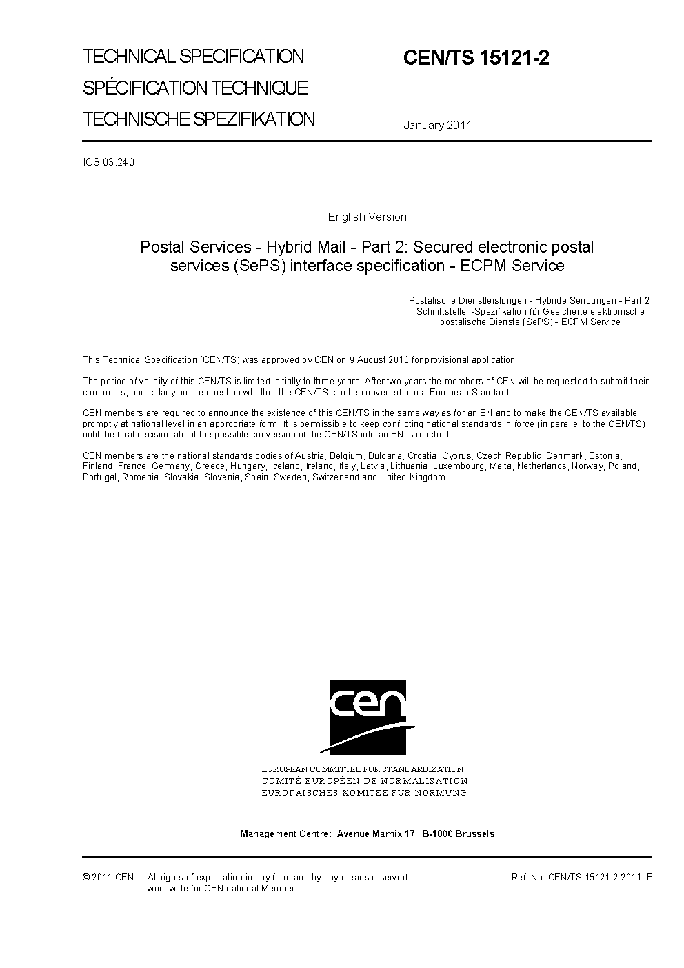 CEN/TS 15121-1, Postal Services - Hybrid Mail - Part 1: Secured electronic postal services (SePS) interface specification - Concepts, schemas and operations. It requires support for five core SePS operations and permits optional support seven others.