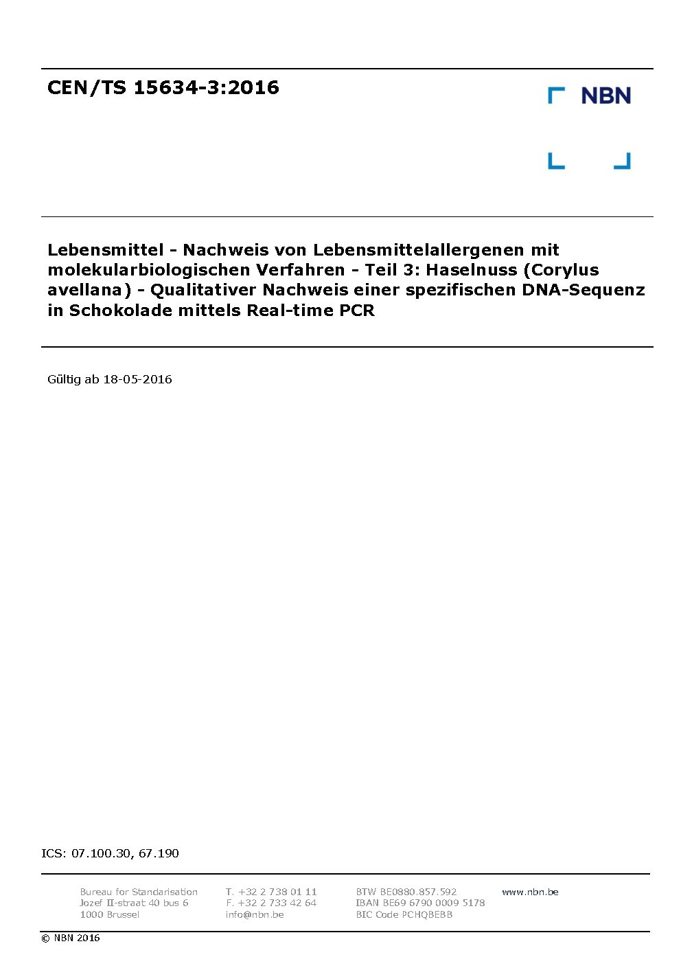 This Technical Specification describes a procedure for the qualitative detection of hazelnut (Corylus avellana) in chocolate. DNA is extracted from the chocolate and a specific DNA sequence for hazelnut detected from the gene for corA 1 [4], [5].
