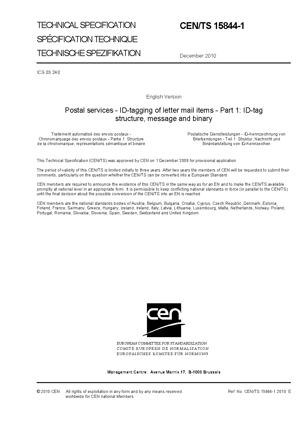 Whilst being generally applicable to domestic mail, the specification has been designed to allow the encoding of cross-border mail and to support its application in the automated processing of such mail.