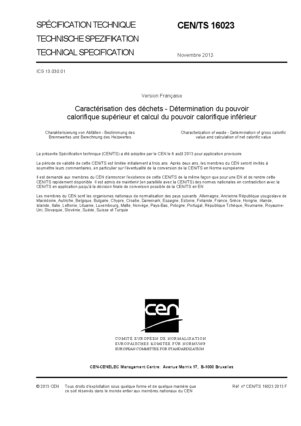 This Technical Specification is applicable for the evaluation of suitability of waste to be treated by thermal processes and for the energy to be recovered.