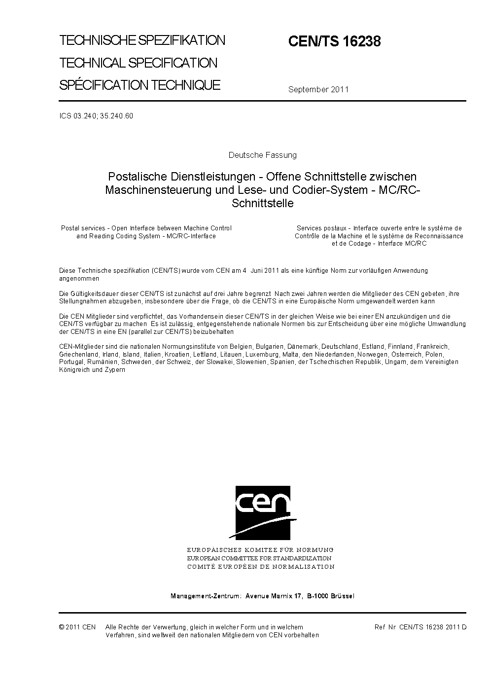 This Technical Specification describes the “Open Standard Interface between Image Processor, Machine Control and Image Controller” (IP/MC/IC Interface) in the context of postal automation equipment.