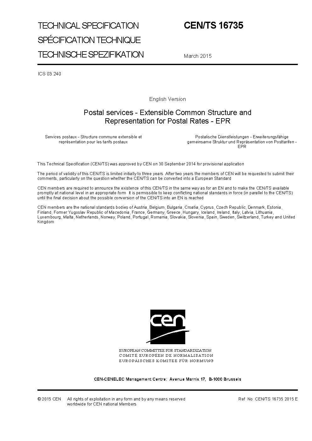 Postal services - Extensible Common Structure and Representation for Postal Rates - EPR