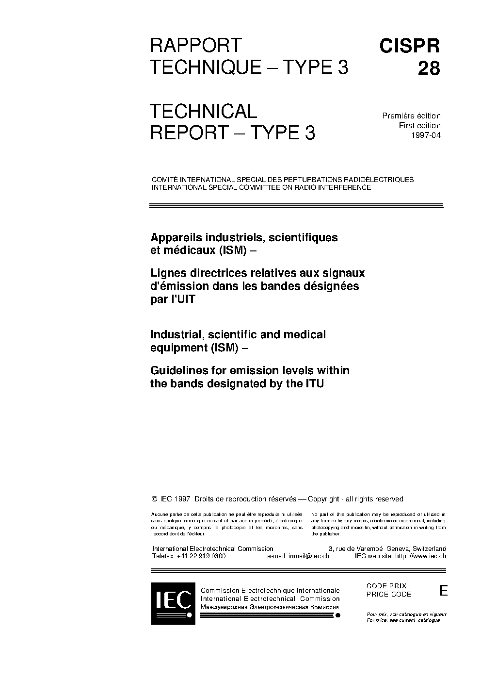 CISPR TR 28:1997 Industrial, scientific and medical equipment (ISM) - Guidelines for emission levels within the bands designated by the ITU